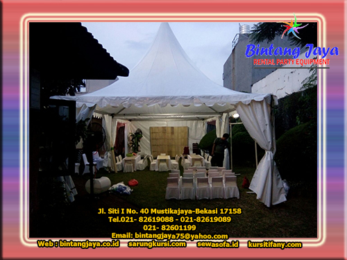 Menyewakan tenda kerucut dengan kerangka alaumunium buatan pabrik dan dengan atap dan dinding penutup tenda kerucut terbuat dari bahan vinyl dengan warna putih sehingga terpal tidak mudah lapuk dan berkesan cerah dan bersih.