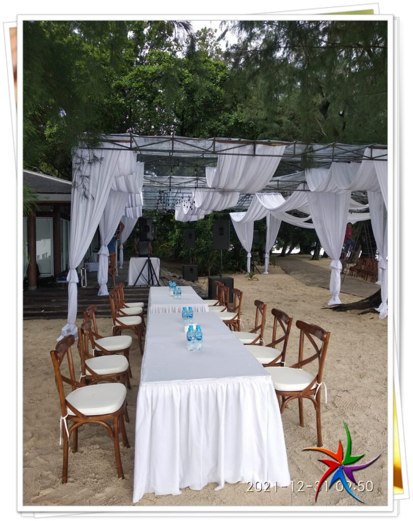 - Dekorasi: mini garden, backdrop, standing flower, podium, panggung, tiang antrian, lampu taman, partisi, welcome board, kotak ampau, bunga meja, karpet, rumput sintetis dll.